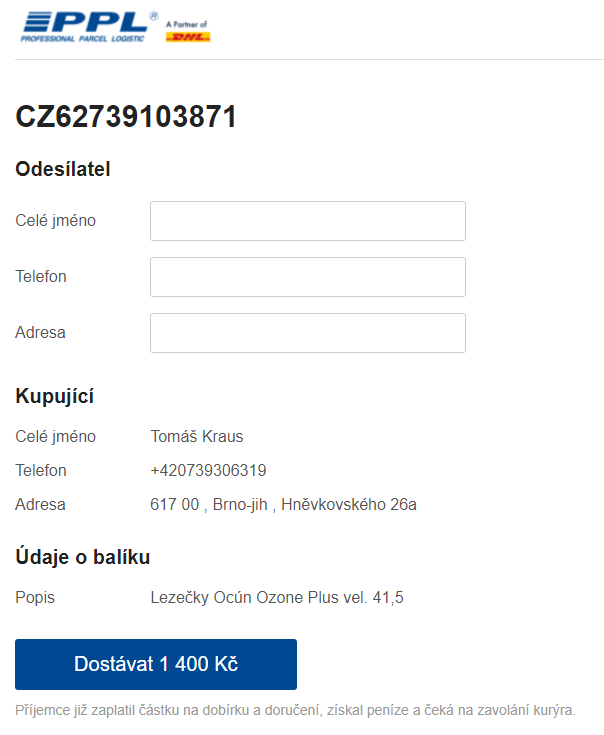 The customer writes to the seller with an interest in the goods. And then he comments: "if the payment arrives, the courier will come to pick up the shipment." After that he sends a PPL link, where the seller navigates to enter the payment card number, validity and CVC code.