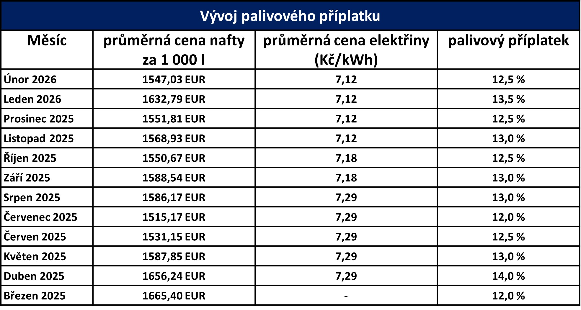 chtěli bychom vás informovat o palivovém příplatku, který činí pro měsíc únor 2026 12,5 %.