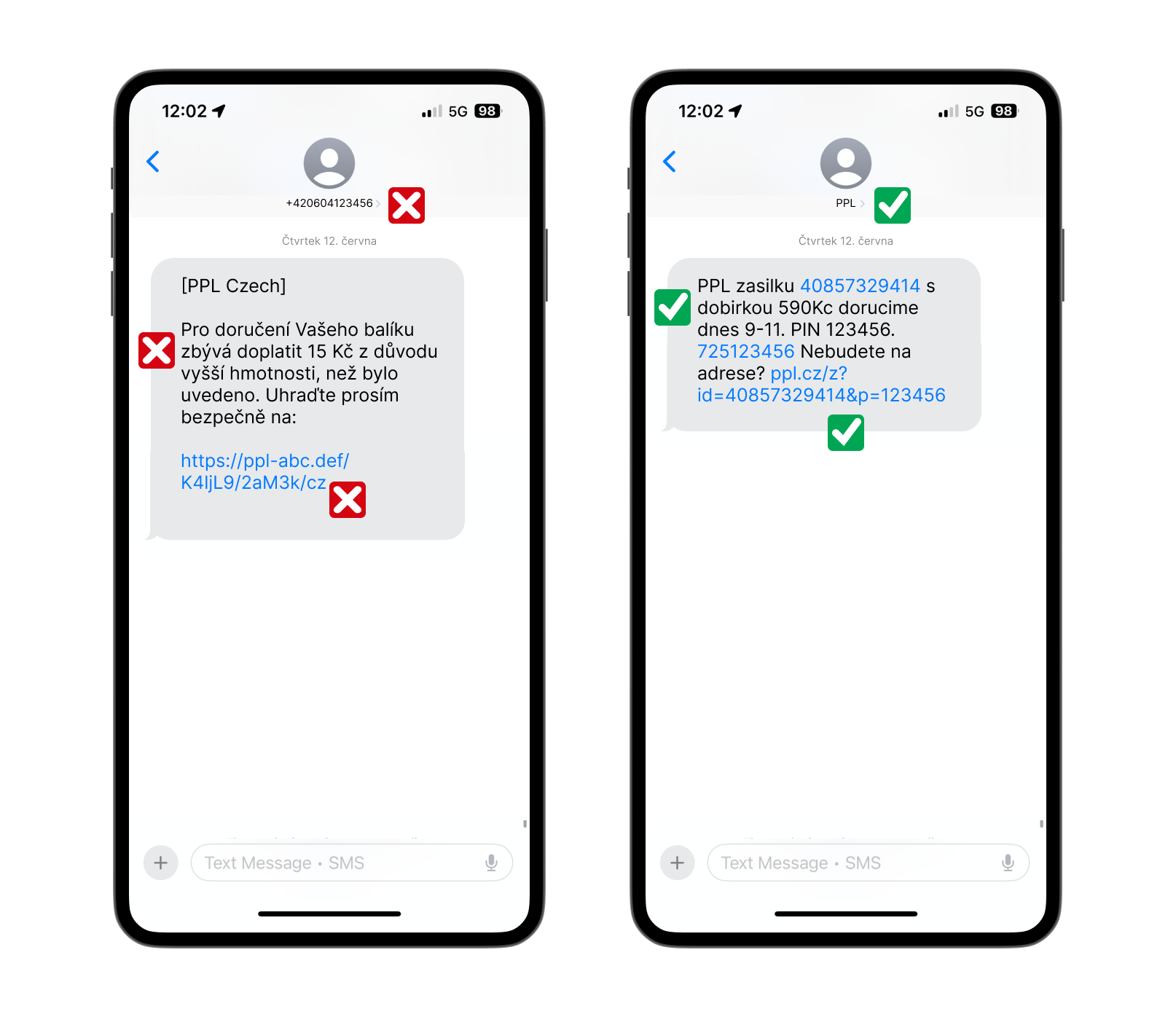 Milí zákazníci, zaznamenali jsme zvýšený výskyt falešných SMS, které naším jménem – jménem společnosti PPL – požadují úhradu doplatku za vyšší hmotnost zásilky. Tyto zprávy jsou podvodné a nejsou posílány námi. Buďte prosím v jakékoli interakci s těmito SMS opatrní a věnujte pozornost i detailům.