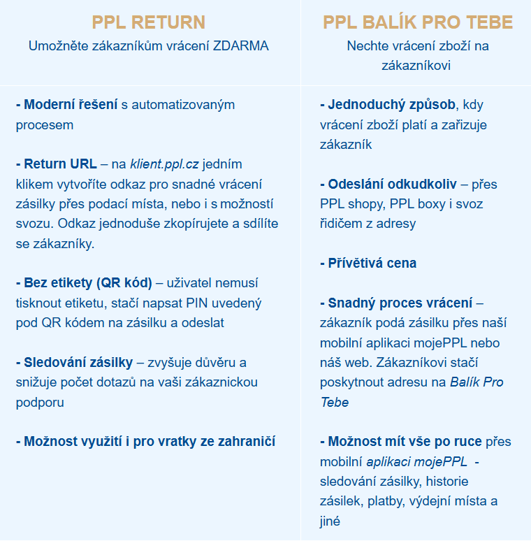 Leden tradičně navazuje na silný závěr roku zvýšeným počtem vraceného zboží. Usnadněte svým zákazníkům tento proces a nabídněte jim pohodlné vrácení přes PPL. Díky naší husté síti a spolehlivým řidičům bude zpětný proces rychlý, jednoduchý a bez starostí.